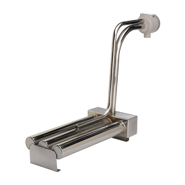 Bottom style, low watt, L-shaped MOTS heater with heavy wall metal sheaths available in steel, 304 stainless steel, 316 stainless steel and titanium. Check solution recommendation chart with your chemical supplier for proper sheath material selection. Single or three phase. 1500-18000 watts, 120-480 volts.